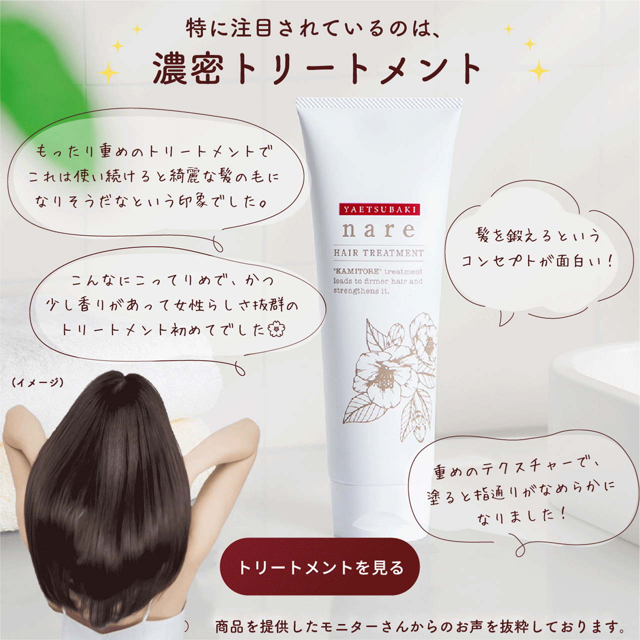 水、ジメチコン、セテアリルアルコール、グリセリン、ベヘントリモニウムクロリド、ツバキ種子油、ツバキ花エキス、ツバキ葉エキス、ツバキ種子エキス、アロエベラ葉エキス、クダモノトケイソウ果皮エキス※2、ヘチマ果実/葉/茎エキス、ゲットウ葉エキス、ヒバマタエキス※3、ミツイシコンブエキス※3、アマモエキス※3、ヘマチン、クオタニウム-33、加水分解ケラチン(羊毛)※6、トウキ根エキス、センキュウ根茎エキス、アカヤジオウ根エキス、ヨモギ葉エキス、オタネニンジン根エキス、シャクヤク根エキス、ホホバ種子油、サトウキビエキス、クラドシホンノバエカレドニアエエキス、ハイビスカス花エキス、マカデミアナッツ脂肪酸フィトステリル、アミノプロピルジメチコン、BG、乳酸、スクワラン、パンテノール、タウリン、プロパンジオール、ペンチレングリコール、トコフェロール、加水分解ヒアルロン酸、リシンHCl、アラニン、ヒスチジンHCl、アルギニン、セリン、プロリン、グルタミン酸、トレオニン、バリン、ロイシン、グリシン、アラントイン、イソロイシン、フェニルアラニン、カプリリルグリコール、アセチルヘキサペプチド-1、エタノール、フェノキシエタノール、香料